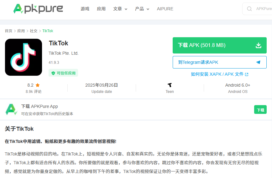 第二步:下载TikTok国际版安装包(APK)
